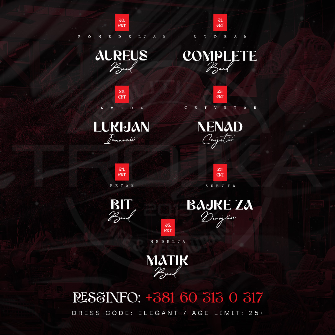 Boutique Trojka je casual dinning restoran internacionalne kuhinje sa dodirom Azije, smešten sa druge strane reke u mirnom delu grada. Pored profesionalne usluge restoran nudi poseban ambijent koji se sastoji od bašte i unutrašnjosti na dva nivoa. Kapacitet restorana zajedno sa baštom je 570 gostiju.