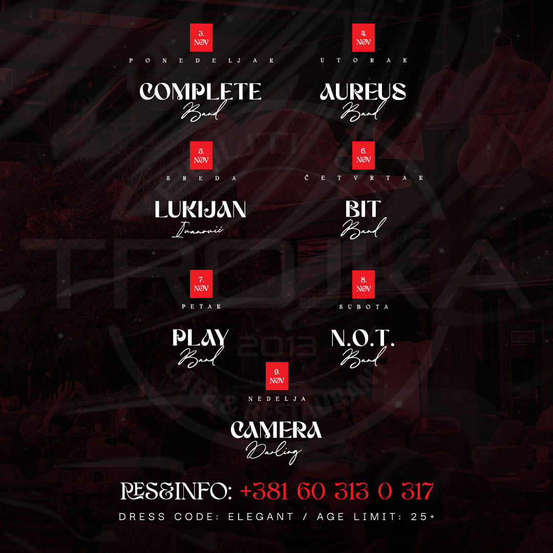 Boutique Trojka je casual dinning restoran internacionalne kuhinje sa dodirom Azije, smešten sa druge strane reke u mirnom delu grada. Pored profesionalne usluge restoran nudi poseban ambijent koji se sastoji od bašte i unutrašnjosti na dva nivoa. Kapacitet restorana zajedno sa baštom je 570 gostiju.